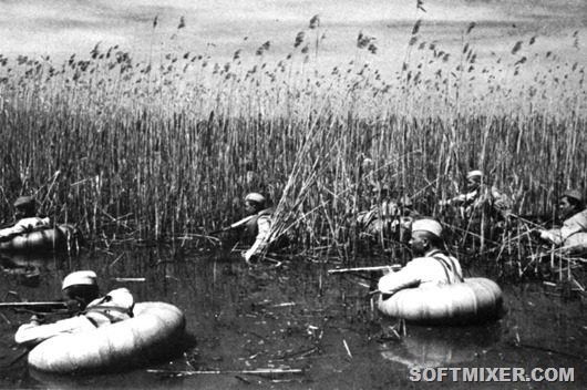 Солдаты ведут разведку в плавнях Кубани на надувных резиновых камерах, 1943 год