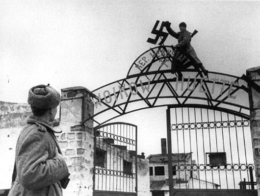 Советские бойцы сбивают фашистскую свастику с входа на территорию завода им.Войкова в освобожденном городе Керчи. 1944 г.