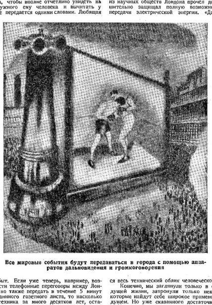 Дальновидение помогло человеку знакомиться с мировыми событиями не только в общественных местах, но и в своей квартире. Особые электрические станции быстро дают возможность увидеть любую часть света, точнее, каждый его уголок. И директору какой-нибудь фабрики уже не нужно будет садиться в поезд или автомобиль, чтобы сговариваться с кем-нибудь по важному делу. Ему достаточно будет одного телефона, чтобы вполне отчетливо увидеть на матовой пластинке нужного ему человека и вычитать у него с лица то, что не передаётся одними словами. Любящая пара, разделённая, быть может, целым океаном или материком, будет с помощью аппаратов дальновидения приветствовать друг друга. Банки начнут обмениваться своими векселями и чеками путём беспроволочной передачи изображения.Что касается газет, то нехватка или дороговизна дерева заставят отказаться от печатания газетных листов. Словом, издатели точно так же пользуются электрическими установками для дальновидения, которыми они и снабжают своих подписчиков. Небольшой столик покрыт сверху молочного цвета пластинкой, на которой появляются световые буквы, составляющие передовые статьи, фельетоны, хронику и т.д. Среди текста могут быть разбросаны и кино-рисунки; ведь беспроволочную передачу кинокартин знали ещё в 1926 году. Уже в наши дни беспроволочная передача письма, изображений и движущихся предметов настолько подвинулась вперед, что является только вопросом времени, когда она войдёт в наш повседневный быт. Если уже теперь, например, возможно не только вести телефонные переговоры между Лондоном и Нью-Йорком, но также передать в течение 5 минут изображения отпечатанного газетного листа, то насколько уйдёт вперёд такая техника за много десятков лет, остающихся до 2000 года.