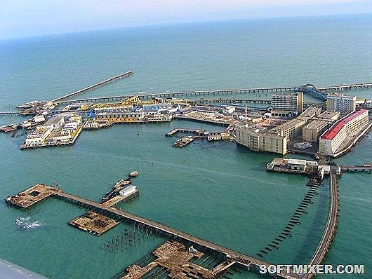 Здесь расположены буровые вышки, соединенные эстакадами, на которых размещен поселок рабочих нефтепромыслов. Поселок разрастался, и в период расцвета включал электростанции, девятиэтажные здания общежитий, больницы, дом культуры, парк с деревьями, хлебозавод, цех по производству лимонада и даже мечеть со штатным муллой.