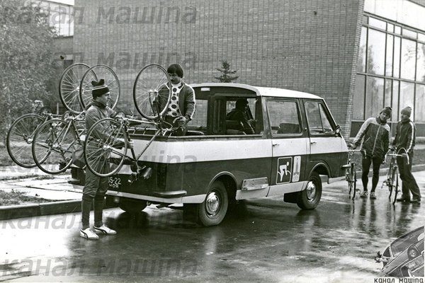 Перевозимые велосипеды закреплялись на заднем борту. На фото хорошо видно, что в задней стенке кабины имелась ширмовая дверь для выхода на платформу