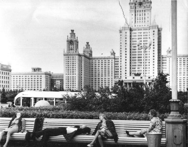 Например, позже скажут, что на этой фотографии, сделанной Галеотти в Москве у здания государственного университета, «очевидно позирующие французы, изображающие безработных».