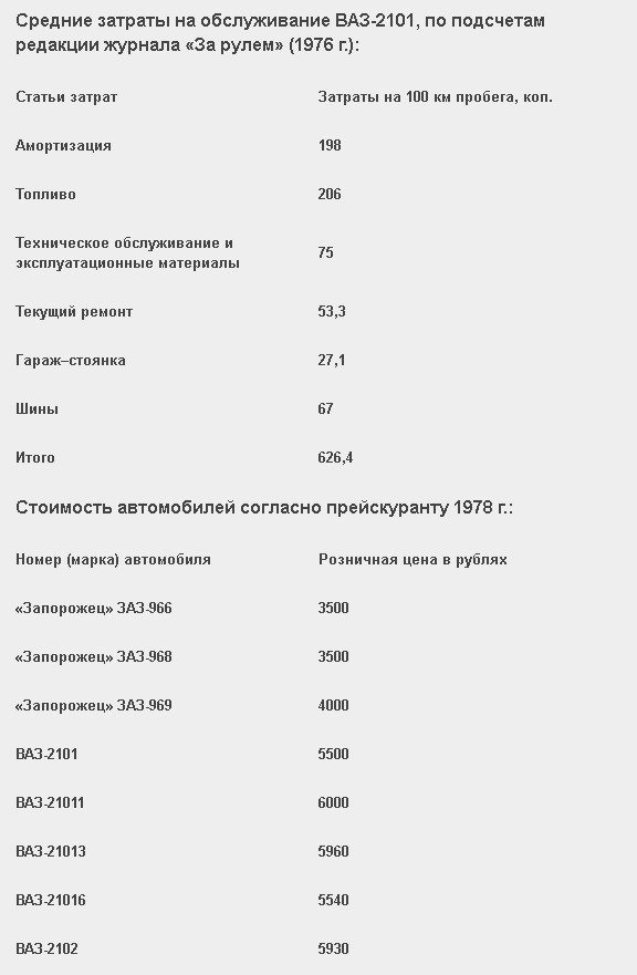 По мере старения автомобилей росли и сопутствующие расходы. По подсчетам редакции журнала «За рулем», произведенным по итогам эксплуатации ВАЗ-2101 в 1976 г., при планировании среднегодового пробега в 15 тыс. км, на обслуживание его следовало отложить из семейного бюджета более 900 руб.