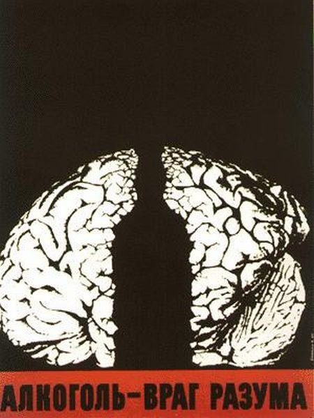 Ну и плакаты времён борьбы за трезвость были. Нго мне лично запомнились антиалкогольные ролики: под рентгеном сидят два мужика — два скелета. Стол, бутылка, стаканы. Налили… Зубами два скелета клац-клац-клац — разоговаривают. Подняли стаканы, чокнулись, подняли к щелям между челюстями (рот), наклонили, вылили.