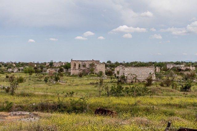 И вот уже последние четверть века на месте некогда 30-тысячного города, находится город — призрак с руинами жилых кварталов, да и два уцелевших минарета, которые по каким-то причинам были сохранены вооруженными силами НКР. Минареты видны еще задолго до подъезда к городу.