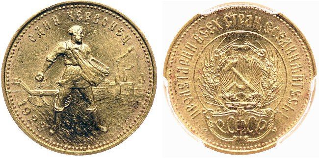 Большее количество старинных червонцев было переплавлено обратно в золотые слитки и перечеканено в новые деньги с разными датами, поставленными задним числом. Все это проделали, так как старое царское золото вызывало большее доверие на рынке, чем новое социалистическое.