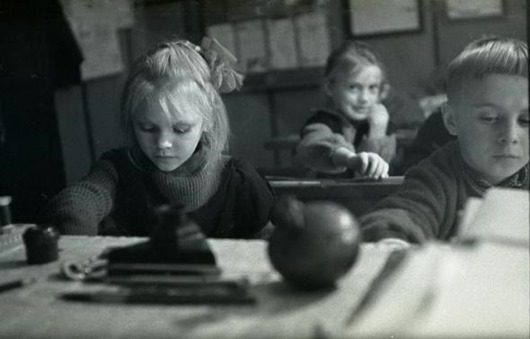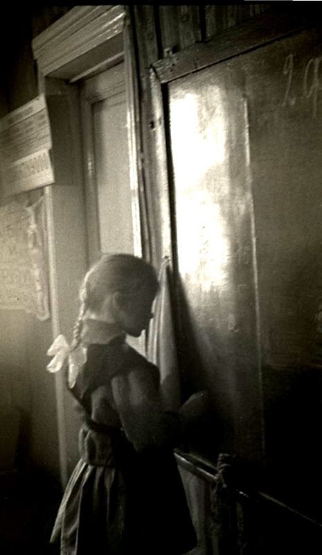 Урок в начальной сельской школе 1964 года. “Ученики с первого по четвертый класс в одной комнате, – пишет автор фотографий Людмила Таболина. – Девочки с одинаковыми косичками. Круглая печка-голландка. Пальтишки и шапки на вешалке в углу…”