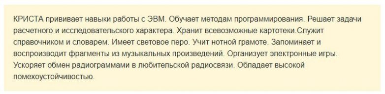 Пользователь, который хотел ввести программы, написанные на языке Бейсике, должен был начинать сеанс работы с компьютером со считывания в ОЗУ машины интерпретатора этого языка. Такая необходимость была из-за отсутствия ПЗУ необходимой емкости.Криста — чудо техники с «тачскрином»