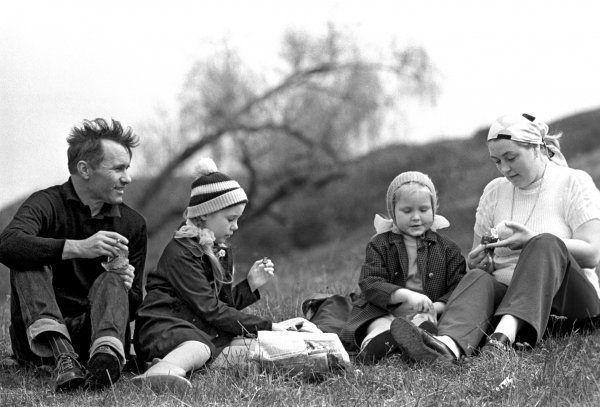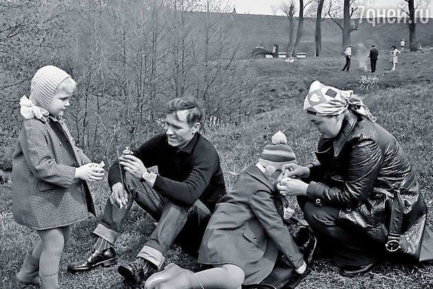 Русский советский писатель, кинорежиссёр, актёр Василий Шукшин с женой, актрисой Лидией Федосеевой и с дочками Олей и Машей. 5 июня 1974 года.