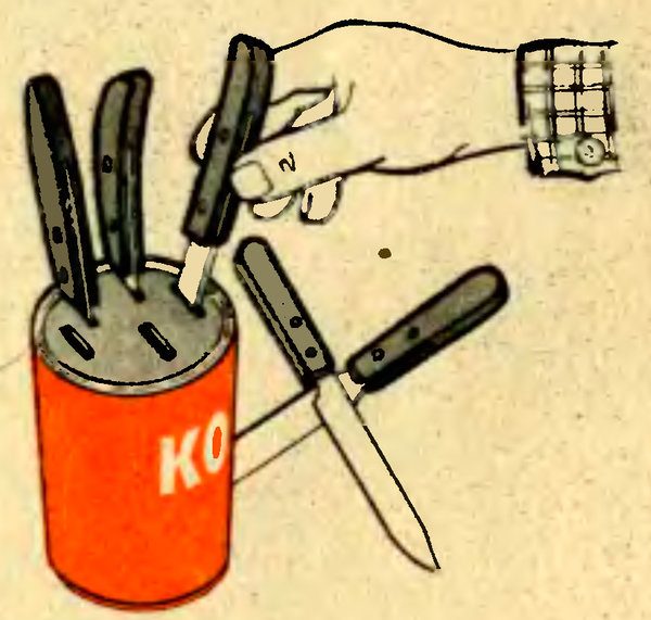 Пустая банка из-под кофе достаточно легко может быть превращена в подставку для ножей. Для этого достаточно лишь проделать в крышке несколько щелей, которые бы совпадали по размеру с шириной лезвий ножей. Решение, правда, не очень хорошее в том плане, что в такой подставке можно хранить ножи только с относительно короткими лезвиями.