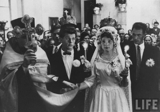 Молодая пара венчается в соответствии с русскими православными обычаями.