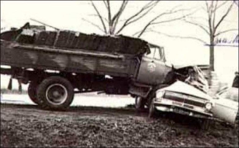Леонид увидел это и начал тормозить, но машина на мокрой дороге пошла юзом. Столкновение было такой силы, что передние колеса грузовика оказались в салоне «Волги».