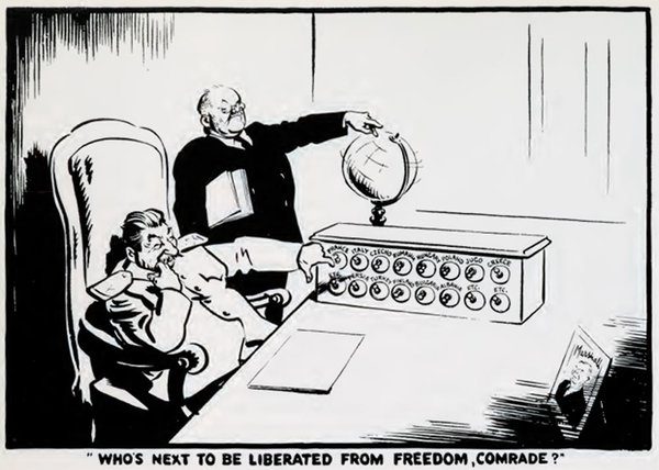 Ну а здесь Сталин изображен в компании министра иностранных дел СССР Вячеслава Молотова. Вместе они решают, какую бы еще страну освободить из лап капитализма, где бы еще устроить «народную революцию».