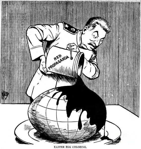 После победы над общим врагом бывшие союзники по антигитлеровской коалиции очень быстро потеряли все точки соприкосновения и перешли к идеологической конфронтации. На этом рисунке мы видим, как Сталин поливает из ведра Землю «Красной пропагандой», тем самым распространяя по миру идеи коммунизма и расширяя сферу советского влияния.