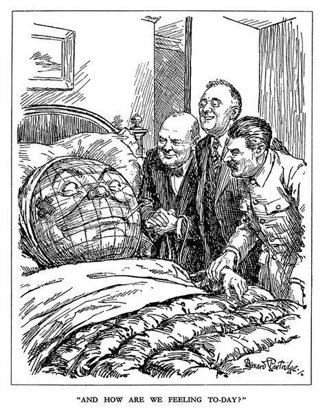 А это – единственная найденная нами карикатура, где Иосиф Виссарионович, не был бы изображен в негативном контексте. На рисунке мы видим сильно пострадавший от кровопролитной войны земной шар и троих глав стран-победительниц нацизма – Иосифа Сталина, Гарри Трумэна и Уинстона Черчилля. Они как бы интересуются у Земли ее состоянием, задавая вопрос «Как ты себя сегодня чувствуешь?»