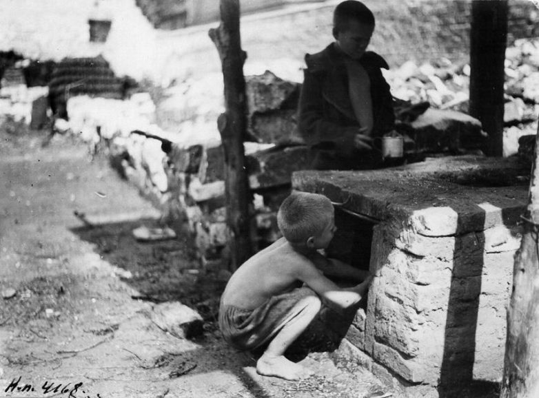 12. Двое беспризорников на улице у печи. Шаболовский детский дом. Москва, 1925.