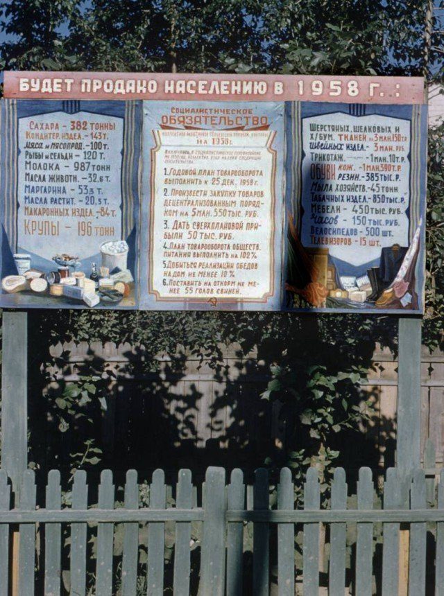 Стенд в некоем волжском городе на фото Говарда Сохурека показывает план продать населению города в 1958 году 15 штук телевизоров