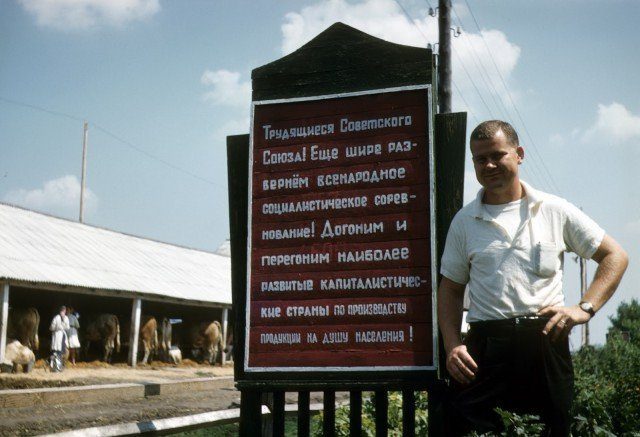 «Но главной гордостью страны была только что начатая космическая программа». Позвольте заметить космическая программа начертана в 20 х годах еще К.Э.Циолковским из 12 пунктов, сейчас человечество.только на 2-м пункте. Я взял из стенда 987 тн молока поделил на 365 дней и получилось что в день в магазине (магазинах) этого села продавали по 2 тн 730 кг. т.е. по 0.5 на человека максимум в нем жили вместе с детьми 5 460 чел. Я склонен думать, по себе знаю, тогда молока выпивали около 1 л. на человека. Ваш любимый корреспондент сфотографировал плакат у какогото завода может быть небольшого села. а скорей всего, судя по социалистическим обязательствам, какой то магазин обязуется сделать товарооборот, закупить продукции у населения а сверхплановой прибыли дать аж на 50 000 руб., это Советскими рублями после 61 года на 5 000 руб. А что касается В.И.Ленина он о кино никогда не говорил, что оно главное. Если уж приводить высказывания исторических личностей, то надо точно, а то получается какая-то насмешка. О том кто приводит можно сказать, что курица снесет яйцо, а кудахчет как будто снесла целую планету.