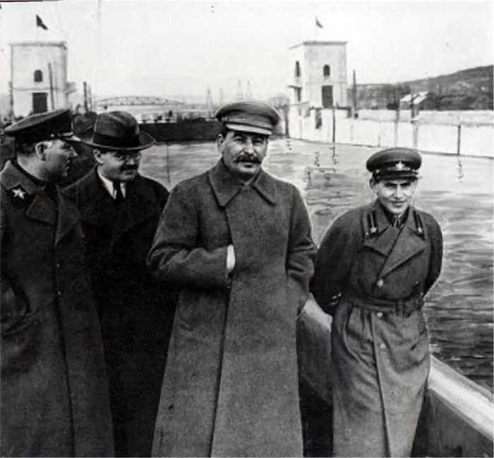 Сталин, Ворошилов, Молотов и Ежов на канале Москва — Волга (март 1937 г.).