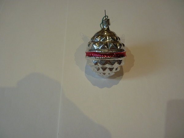 Тоже интересная елочная игрушка советской эпохи.Уж не знаю, на что похоже это елочное украшение, но оно тоже перекочевало с прилавка ко мне в рюкзак, ибо приглянулось визуально.