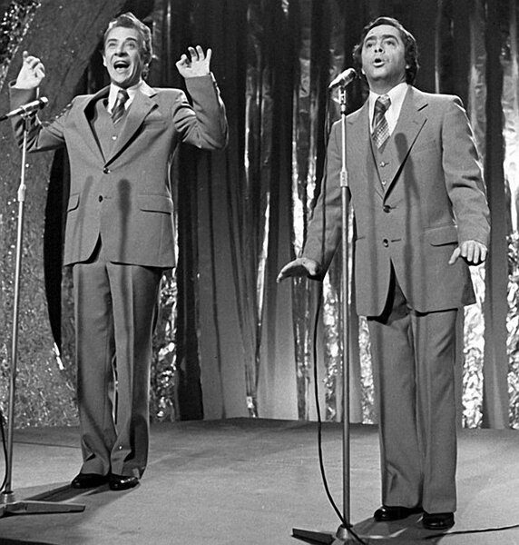 Артисты эстрады Вадим Тонков и Борис Владимиров выступают на новогоднем телевизионном «Голубом огоньке», 1973 год