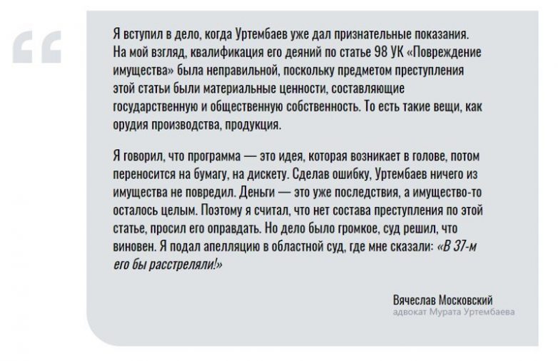 Но особенность этих случаев в том, что преступники, по сути, подделывали бухгалтерию — только вместо гроссбуха была вычислительная машина. Дело Уртембаева пришлось рассматривать под другим углом. Ведь он ничего не крал, не ломал оборудование, не портил продукцию — всего-то внёс изменения в программу