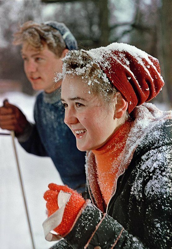 Монтажница Наташа Елизарова и слесарь-сборщик Александр Пирожков на лыжной прогулке, 1961 год. Чувствуется рука гениального мастера светописи.Уральский завод тяжелого машиностроения (Уралмаш).