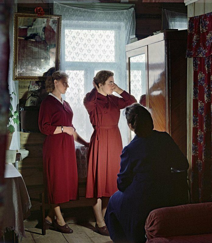 Заботливо ухаживают за цветами, посаженными на территории садика. Н.Козловский, 1953 г.В клуб на вечер. Московская обл., с. Кривцы. Борис Кузьмин, 1959 год.