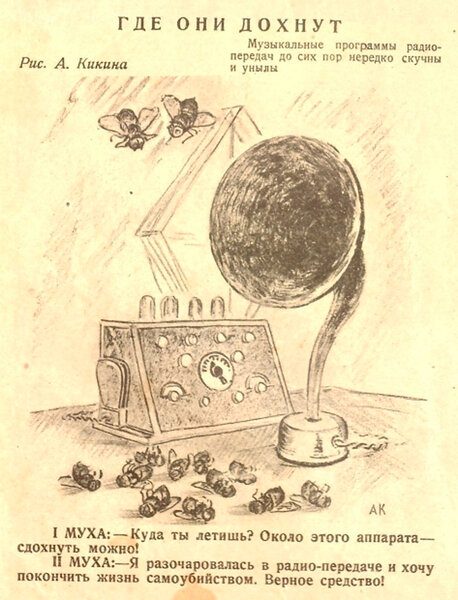 Журнал «Крокодил». Выпуск №12. 1927 г.А здесь «Крокодил» обрушился с критикой на редакторов, ответственных за содержание радиопередач. Судя по содержанию рисунков они были явно не самыми веселыми и не вызывали интереса аудитории. Возымел ли такой «подкол» эффект? Наверное, этого мы никогда не узнаем.