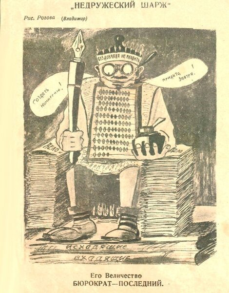 Журнал «Крокодил». Выпуск №12. 1927 г.Бюрократия – еще одно крайне негативное явление, во многом оказывающее отрицательное влияние не динамику общественного развития. Из-за всех этих многочисленных совещаний, согласований, «визирований», бумажной волокиты и других «бюрократических» составляющих во многом страдают как экономика страны, так и простые граждане.