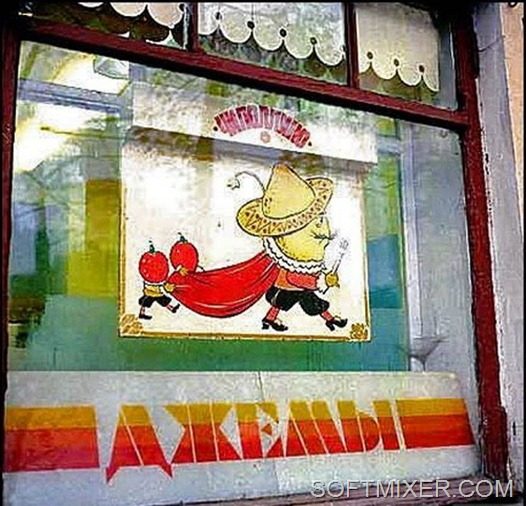 Олимпийский мишка в нижней части витрины вроде подтверждает первоначальную гипотезу. Не знаю как вас, а меня так и тянет войти в этот магазин. В котором, безусловно, никаких пустых полок не могло быть. Что сразу видно по витрине.