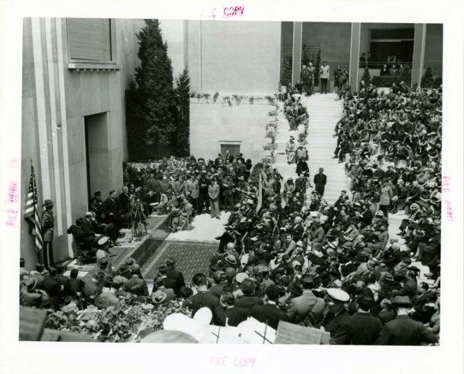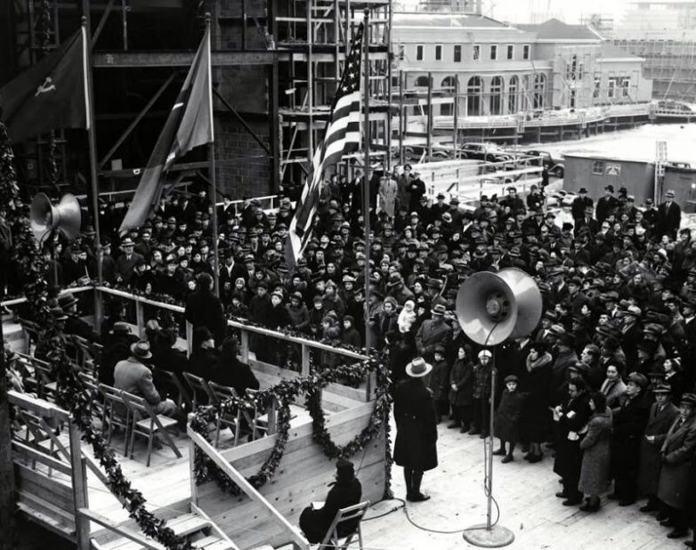 5 декабря 1938 года. Советские сотрудники и инженеры с детьми работающие на строительстве павильона, собрались на митинг посвященный двухлетней годовщине принятия второй конституции СССР. На митинге присутствовал Борис Иофан.