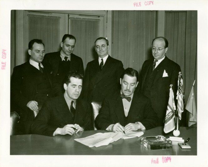 Подписание соглашения об участии между выставочной корпорацией и представителями советского правительства. На фото слева направо: полномочный представитель СССР в США Трояновкий, президент выставки Уэлен и советник Полномочного представительства СССР Уманский