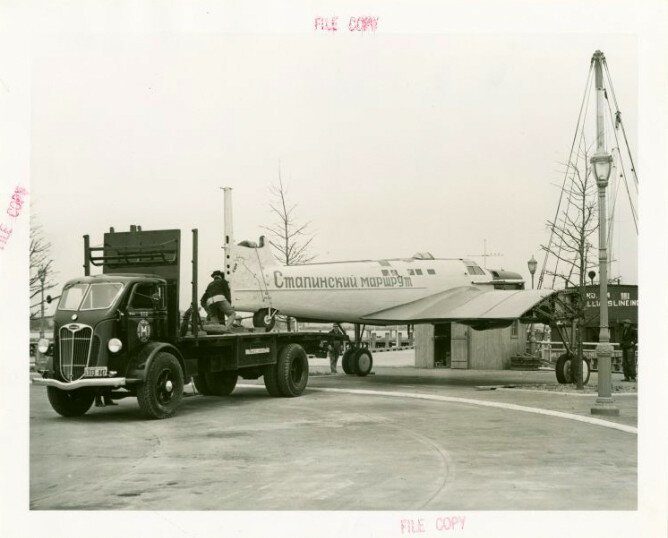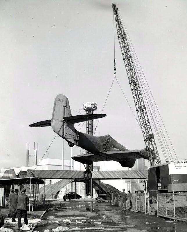 Разгрузка самолета АНТ-25 с борта судна на территорию аэропорта Флойд Беннет Филд.