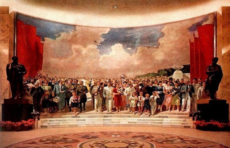 Войдя через главные двери справа, взгляду посетителей открывалось огромное панно размером 16 на 9 метров с изображением рабочих, летчиков, полярников, артистов, ученых и прочих героев страны советов, идущих общей дорогой социализма навстречу светлому будущему. Работа называлась „Знатные люди страны Советов“, и была выполнена коллективом из 11 художников под руководством Василия Ефанова.