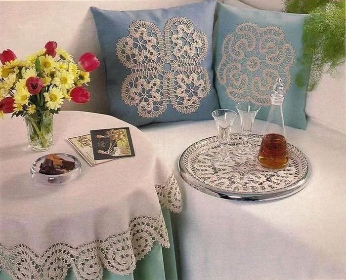 Такими вещичками в советское время, многие украшали комнату. Ими накрывали телевизор, ставили на них вазы и статуэтки. В наши дни салфетки тоже можно использовать, и это не будет выглядеть пережитком прошлого. Можно нашить их на наволочки диванных подушек, или повесить в рамке на стену. Кружева ручной работы будут придавать уют и украшать интерьер в стиле кантри.