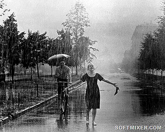 Снимали фильм быстро, в прекрасное летнее время, и атмосфера на съёмках была озорная и дружеская. В пронзительной немой сцене под ливнем, когда босая девушка идёт по лужам, а паренёк на велосипеде крутит следом и держит над ней зонтик, сняли аж трёх барышень, в три захода.