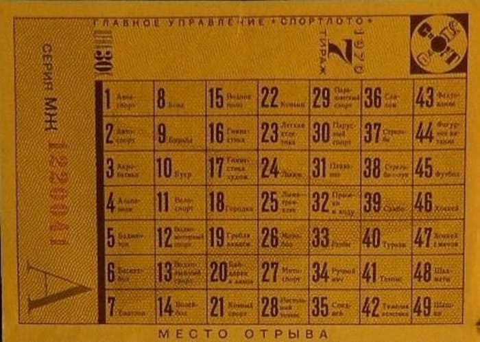 Заместитель председателя Спорткомитета СССР Виктор Ивонин стал создателем первой советской лотереи «Спортлото». Он рассказывал: «Наш главный вопрос был: насколько лотереи соответствуют кодексу строителя коммунизма? Появление «Спортлото» стало ответом: игра имела огромный резонанс, люди откликнулись, а финансовые результаты были такие, что Спорткомитет в конце концов отказался от бюджетных денег и полностью перешёл на самофинансирование при помощи «Спортлото». Эта лотерея, по сути, содержала советский спорт». Первый розыгрыш по формуле «6 из 49» (нужно было отгадать 6 цифр из 49 возможных) провели 20 октября 1970 г. в качестве эксперимента, и этот эксперимент оказался очень успешным! К первому же тиражу удалось реализовать 1,5 млн билетов стоимостью по 30 копеек каждый. При этом 50% выручки от лотереи государство направило на финансирование спорта, а вторую половину – на выплату выигрышей.