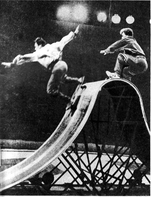 Но и это не всё. Странный для всех скейт стал появляться и в массовой культуре – советском цирке и кино. Еще в 1976 году циркач Анатолий Калинин, увидев в иностранном журнале необычный снаряд, решил попробовать использовать его в своих представлениях. Вышло забавно.