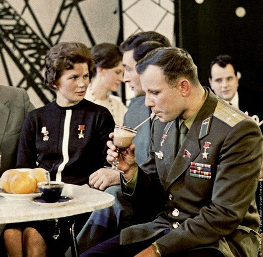 Вечеринка в «Звездном городке», которая была устроена в честь космонавтов весной 1965 года. Слева — Юрий Гагарин, справа — Алексей Леонов.