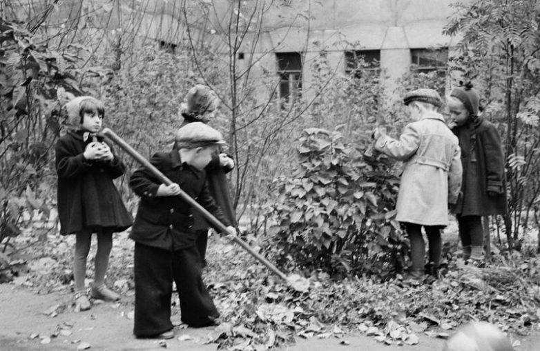 Первый кадр вызывает сомнение. Девочки в БЕЛЫХ гольфах работают лопатами. Это пыльно и грязно. Старались надевать рабочую одежду в таких случаях. Хотя, часто школьники этим занимались прямо после уроков.