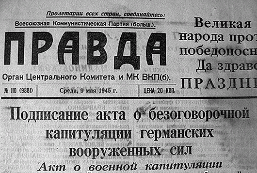В тот день военкор Александр Устинов писал: «В ночь на 9 мая 1945 года москвичи не спали. В 2 часа 10 минут диктор Юрий Левитан прочитал Акт о военной капитуляции фашистской Германии и Указ Президиума Верховного Совета СССР об объявлении 9 мая Днем всенародного торжества – Праздником Победы”.
