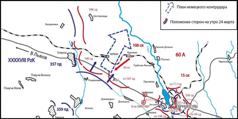 Здесь в обход Тарнополя с севера неспешно наступала пехота нашей 60-й армии (140-я и 107-я сд), усиленная противотанковыми пушками и 59-м отдельным танковым полком, — всего 12 Т-34. Позади у красноармейцев действительно была река Серет.