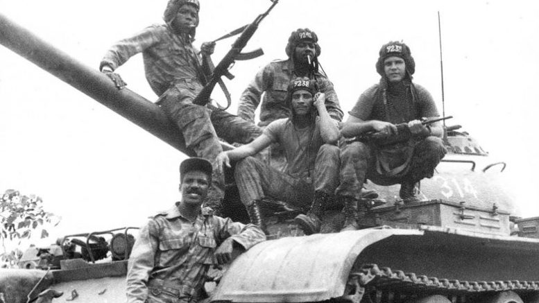 Ангольские бойцы за свободу от колониализма с советскими «операторами», обучавшими их управлять танкамиАнгольского лидера Антонио Агостиньо Нето, поэта и личного друга легендарного кубинского революционера Че Гевары, сразу же публично поддержал Фидель Кастро. Кубинские добровольцы воевали в Анголе совершенно официально. Участие советских военных специалистов скрывалось, однако только через Анголу с 1975 по 1990 год прошло 10 000 наших военных переводчиков, офицеров и солдат (через Мозамбик — около 4-х тысяч).