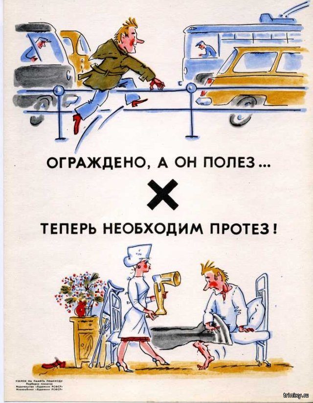 Почему-то одних пешеходов на плакатах ругают. В наше время сразу труп, какая больница? У нас в городе сбивают на пешеходных переходах, иной раз насмерть. А некоторые остановки таранят. Неактуальные плакаты эти давно.