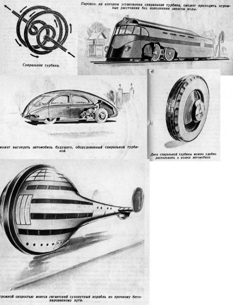 В СССР придумали улучшенный паровой двигатель на спиральной турбине, а также паровоз, машину и корабль с таким двигателем. 1939 год, 4 номер.