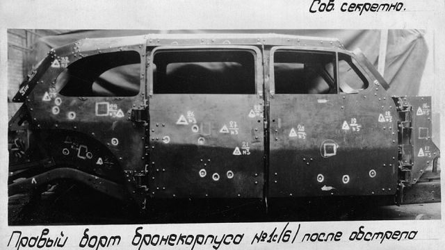 Кузов этой машины спроектирован в виде бронекапсулы, поверхность которой была обшита обыкновенными кузовными листами. Подобный агрегат стал первым в СССР бронированным автомобилем. Не удивительно, что такое изобретение было засекречено долгое время. Бронекапсула обязательно должна была поместиться в общую конструкцию так, чтобы внешне машина напоминала старую модель ЗИС-110. Она не раз подвергалась испытаниям в виде обстрелов. Теперь у нас есть возможность посмотреть на результаты подобных проверок.
