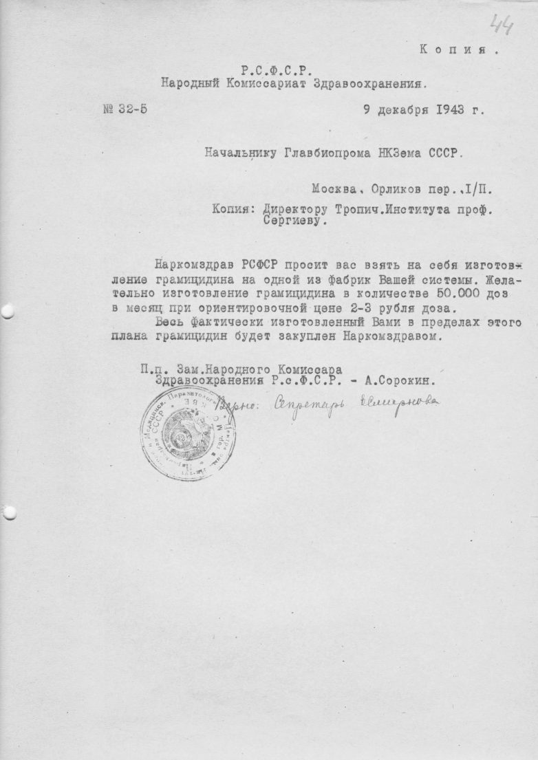 Дюбо также сообщил российским микробиологам, что в Америке строится большое количество заводов по производству грамицидина, и если советский штамм окажется эффективнее, имело бы смысл для спасения жизней солдат производить именно его.