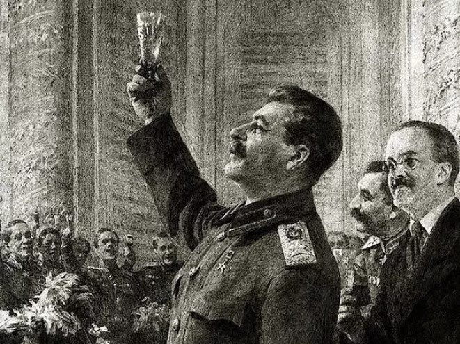 За столом на этих приёмах Сталин шутил часто. Как-то на одном из них приглашённый артист Абрикосов крикнул: «За ваше здоровье, товарищ Сталин!», выпив полный фужер водки. Сталин немедленно ответил: «Подумай о своём».