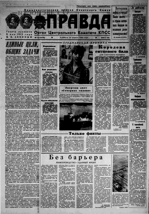 26 апреля 1986 года произошла авария на Чернобыльской АЭС. В течение нескольких дней главное СМИ СССР – газета «Правда» – не замечало событий в Припяти.